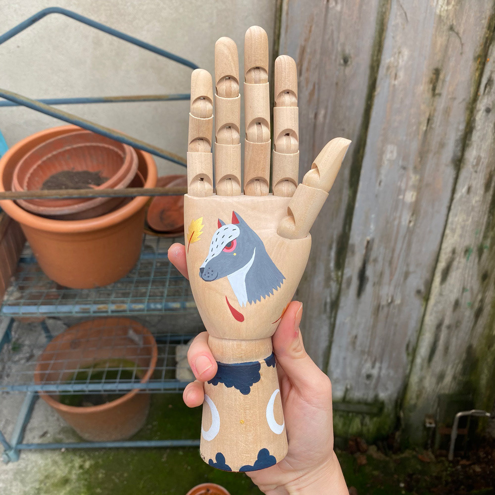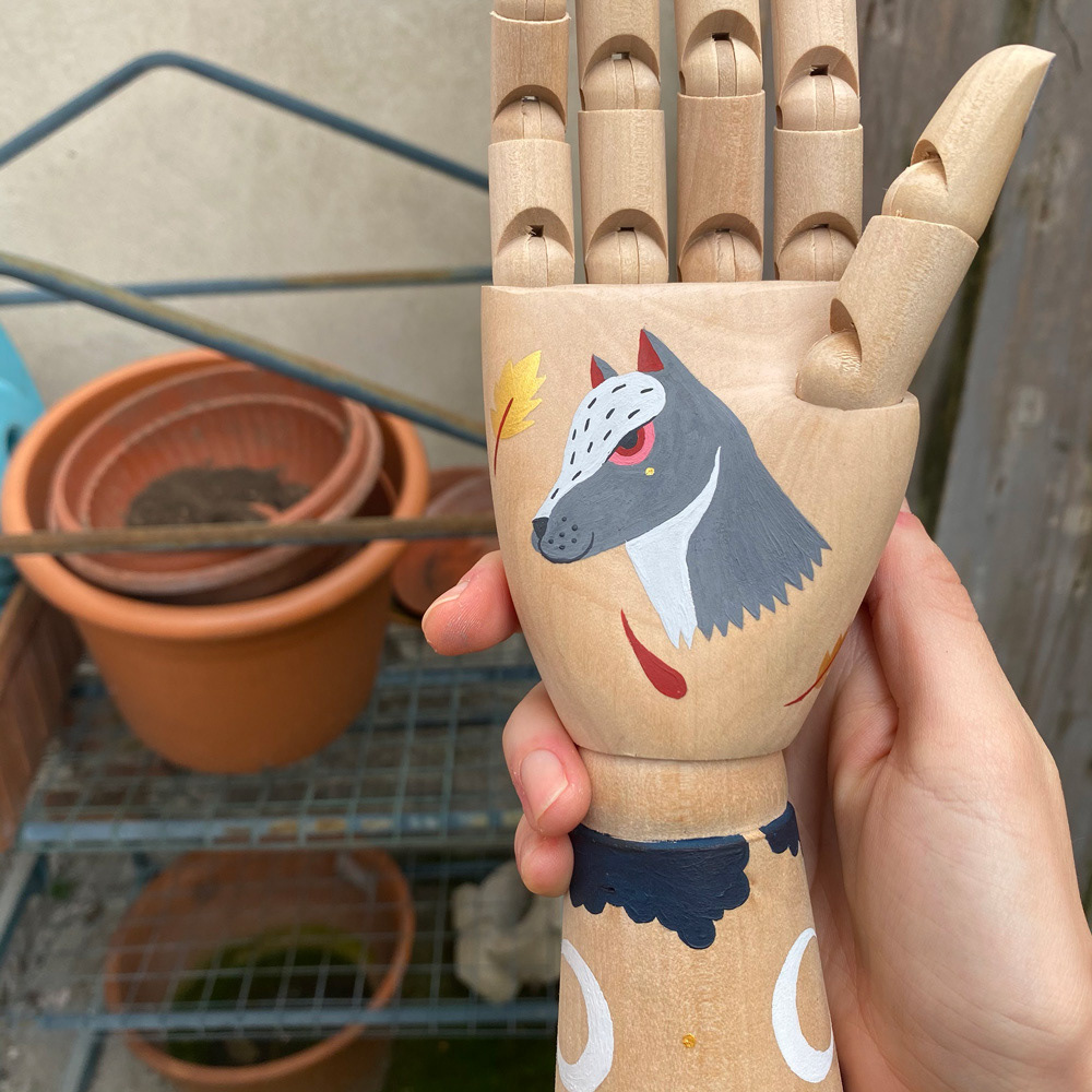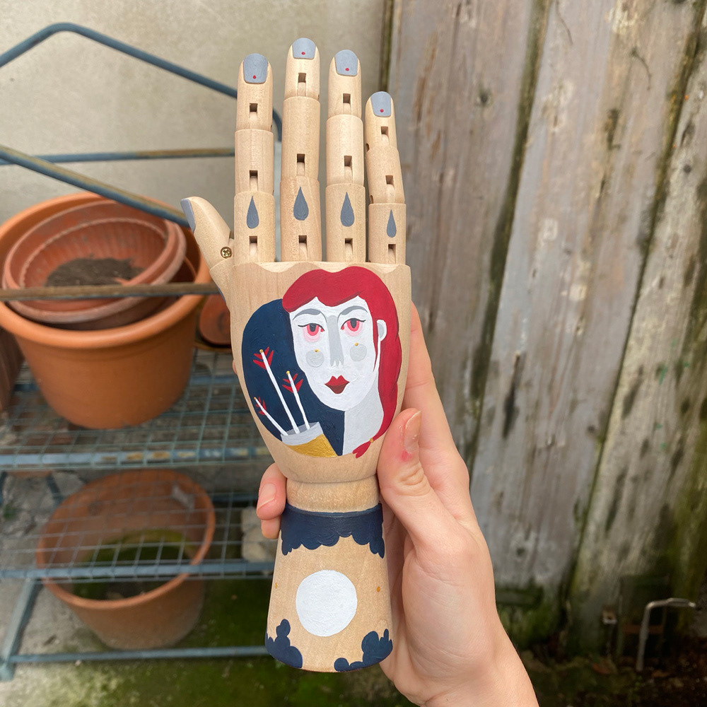 Divinità della religione greca, dea della caccia, degli animali selvatici, della foresta, del tiro con l'arco e guidatrice del carro della luna. Mano in legno disegnata e dipinta a mano con colori acrilici. /// ON COMMISSION ///