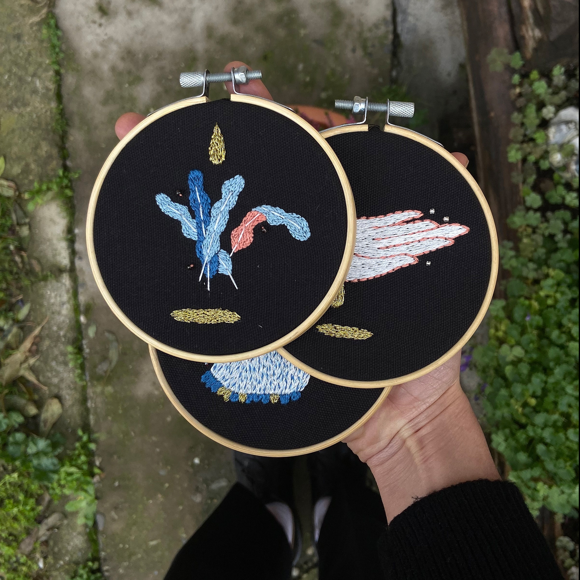 Dal sangue dorato versato dagli dei, crebbero alcune erbe chiamate pharmaka, le stesse che Zeus fece ingoiare a Crono così da fargli rigettare fuori i suoi cinque fratelli. I doppi poteri di queste erbe furono usati anche da Circe. Si narra che trasformasse i suoi uomini in maiali, leoni, tori, arieti o galli. Trittico a tema Odissea disegnato e ricamato a mano dopo aver letto il libro "Circe" di Madeline Miller.