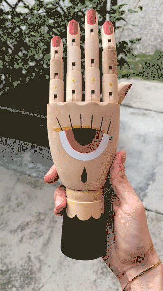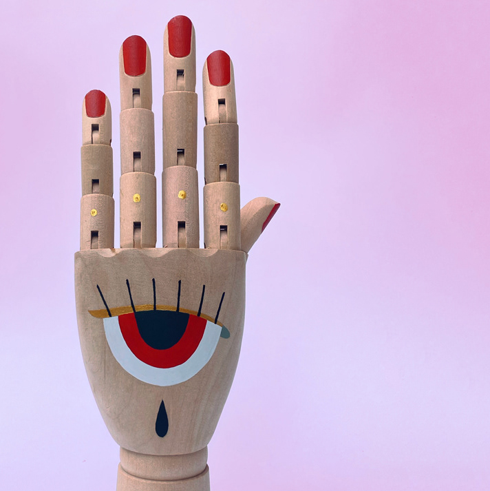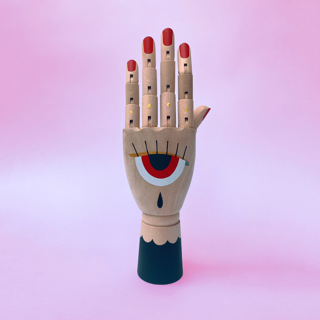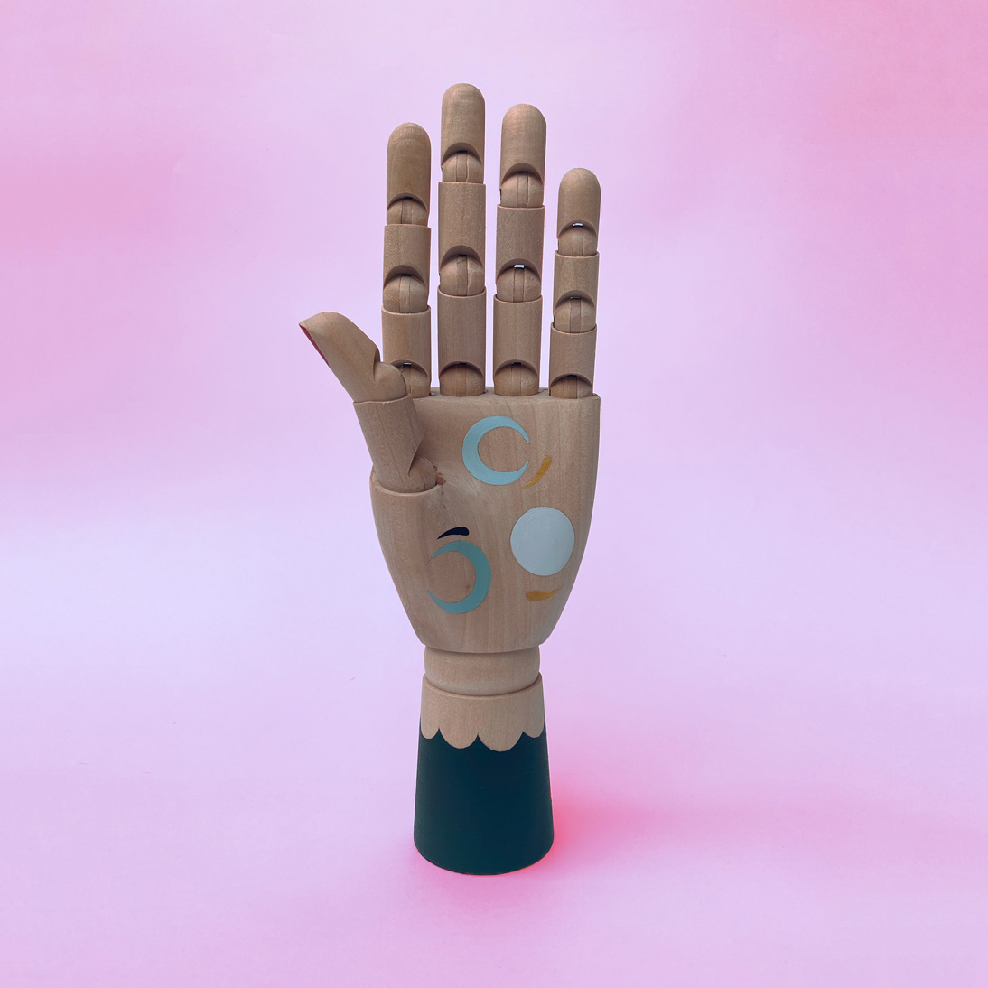 Un inno alla femminilità e al suo rapporto imprescindibile con la Luna. Mano sinistra in legno disegnata e dipinta a mano con colori acrilici. /// SOLD OUT ///